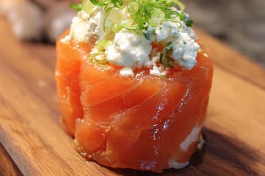 Misture salmão picado, cream cheese, cebolinha e enrole no formato de cone.