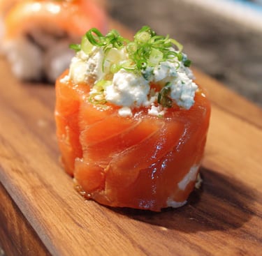 Simplicidade absoluta: bolinho de arroz + fatia de salmão.