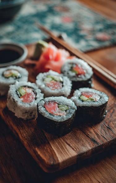 Organize as peças em linhas ou semicírculos, mantendo espaço entre elas para dar sensação de ordem. Uma boa apresentação nunca parece “lotada”. Finalize com pequenos detalhes de cor, como gergelim, cebolinha ou raspas de limão — que além de deixar bonito, adicionam aroma fresco. Molhos devem ser servidos em potinhos separados, evitando que o sushi chegue molhado.