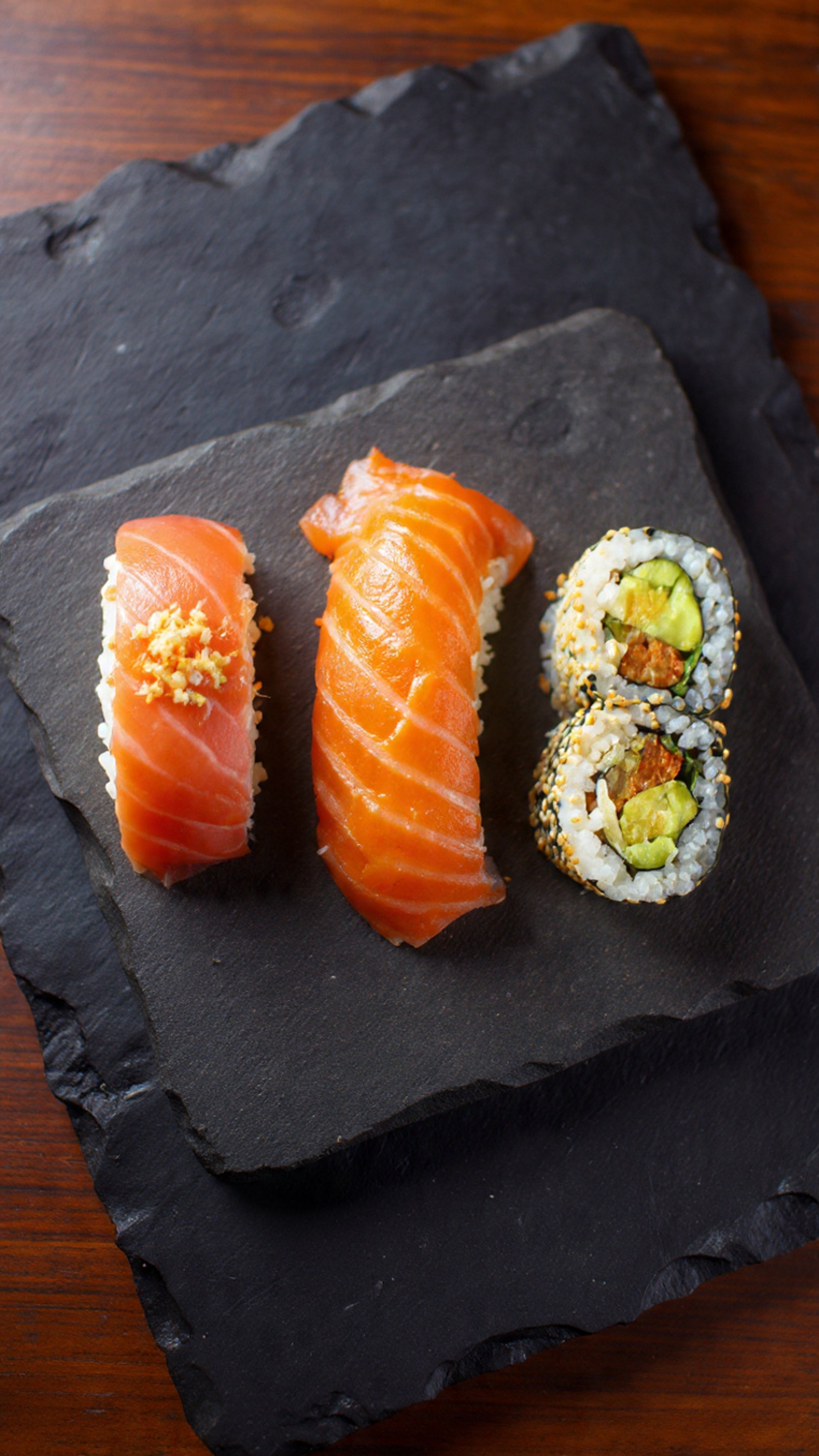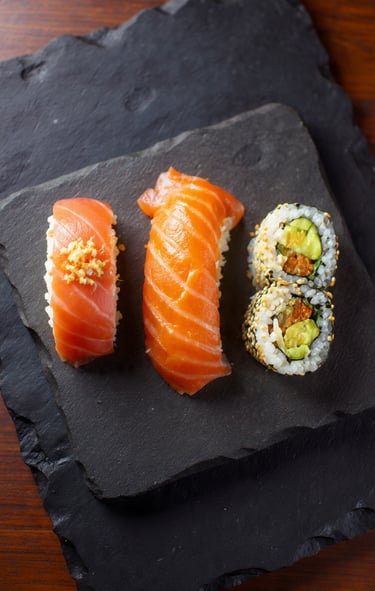 Por outro lado, o maki é o famoso rolinho envolto em alga nori. Dentro dele vão arroz e um ou mais ingredientes, como pepino, salmão, peixe branco ou manga. O maki pode ter variações, como o hossomaki (fino), futomaki (grosso) ou uramaki (arroz por fora). Ele é o mais versátil dos três e ideal para quem gosta de criatividade e combinações.